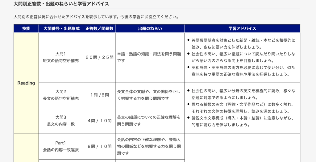 リスニングも、以前より少し聞き取りやすくなった感触はあった気がしましたが、17/27点と大きな伸びはありませんでした。