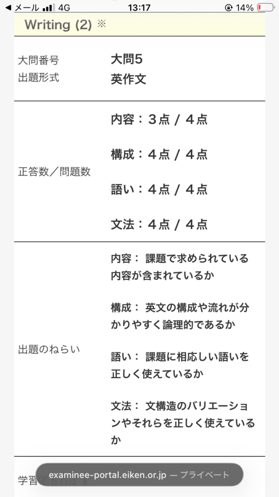 今回の私の英作文に関しては、出来があまり良くなくて手応えは13/16点を予想していましたが、実際の得点は15/16点でした
