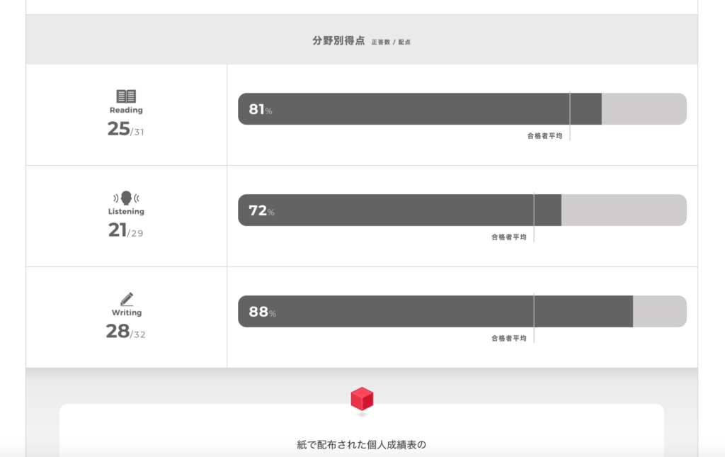 今回、英作文とも合わせてライティングの得点は28 / 32点だったのですが、私のライティングの合計の素点で-4点にも関わらず、CSEスコアは731 / 750点と満点近い得点になりました。